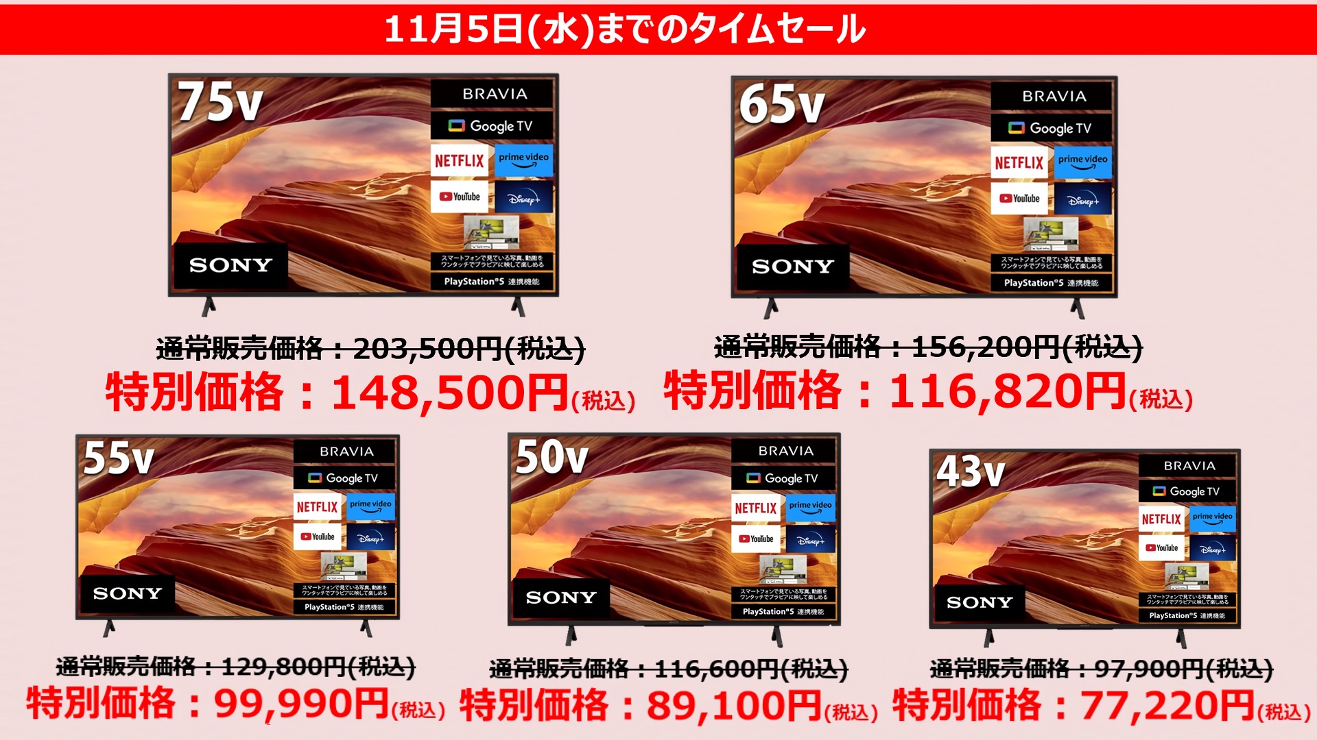 最新ブラビア MiniLED搭載BRAVIA 7【75型・65型・55型】、BRAVIA 5【55型】が、ソニーストアで最大3.3万円値下げ。