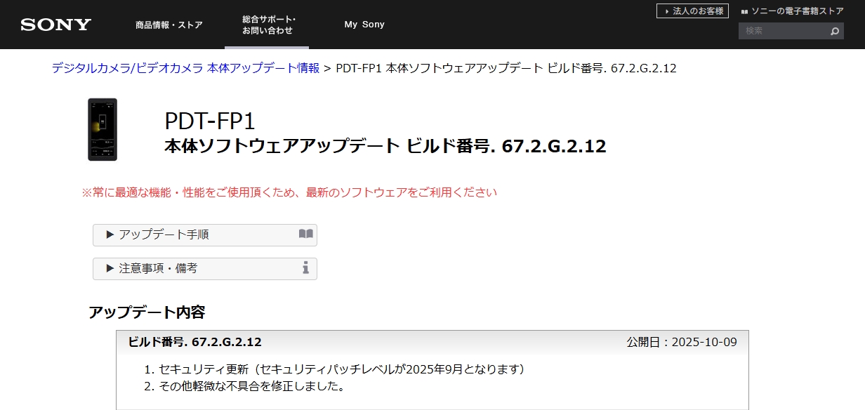 ソニー ポータブルデータトランスミッター「PDT-FP1」に、ソフトウェアアップデート配信開始( Ver. 67.2.G.2.12 )。セキュリティパッチレベル2025年9月。