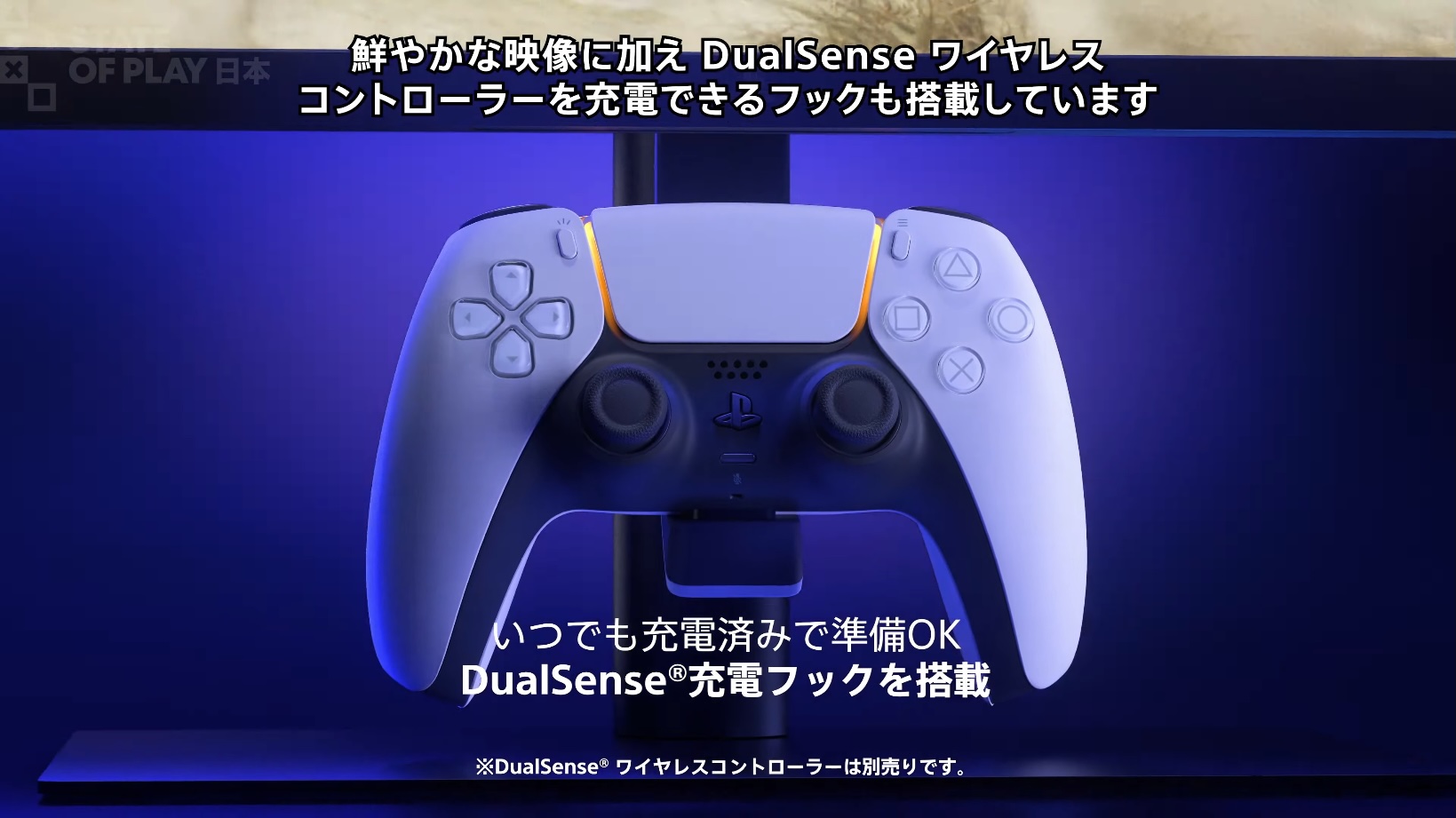 コントローラーの置き場所にもなり、かつ充電も一緒にできるというPS5専用ディスプレイならではのギミック。