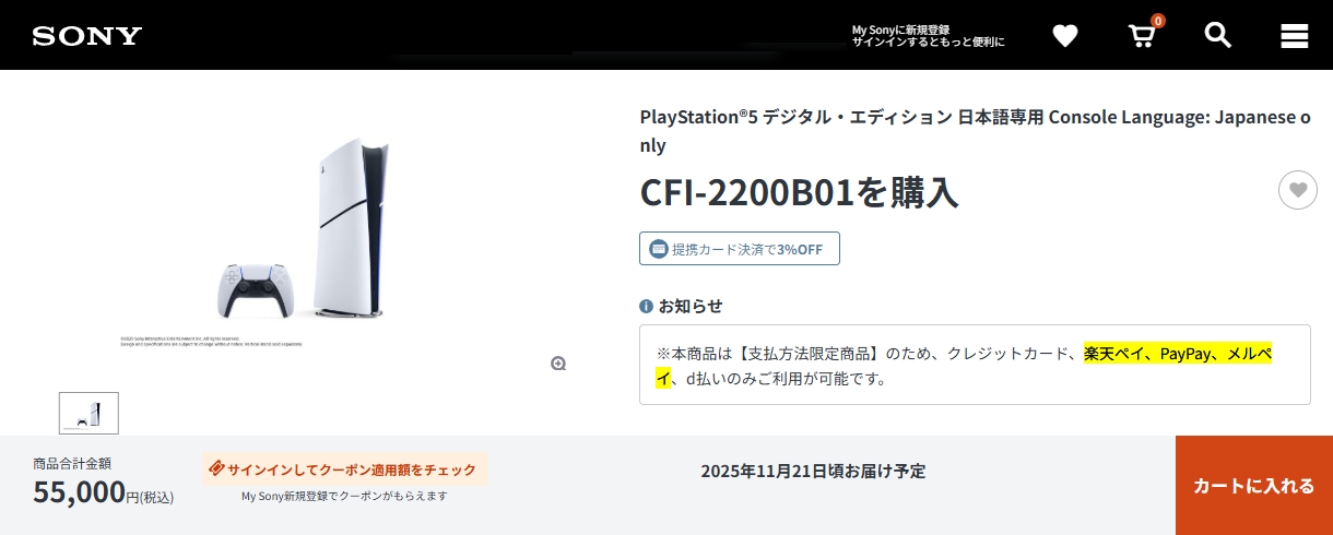「楽天ペイ」「メルペイ」については、ソニーストアで55,000円で購入できるPlayStation(R)5 デジタル・エディション 日本語専用 CFI-2200B01の支払い方法としても利用できる。