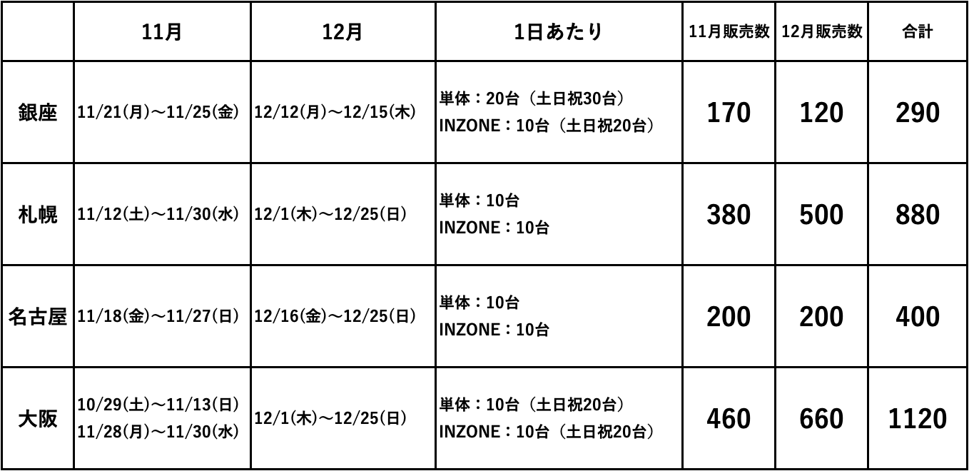 ソニーストア 銀座:平日30台(単体20台、INZONE10台)、土日祝50台(単体30台、INZONE20台)