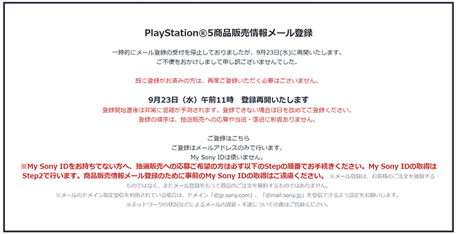 抽選販売の手続きは9月23日(水)11時から開始。サインインやMy Sony IDの取得は不要。