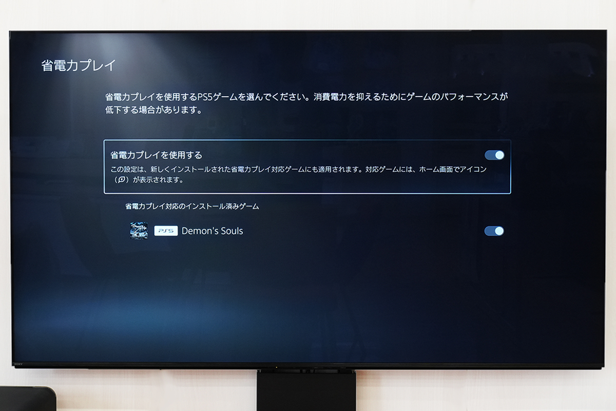 対応しているゲームがPS5にインストールされていると、設定から省電力プレイを有効にすることができる。
