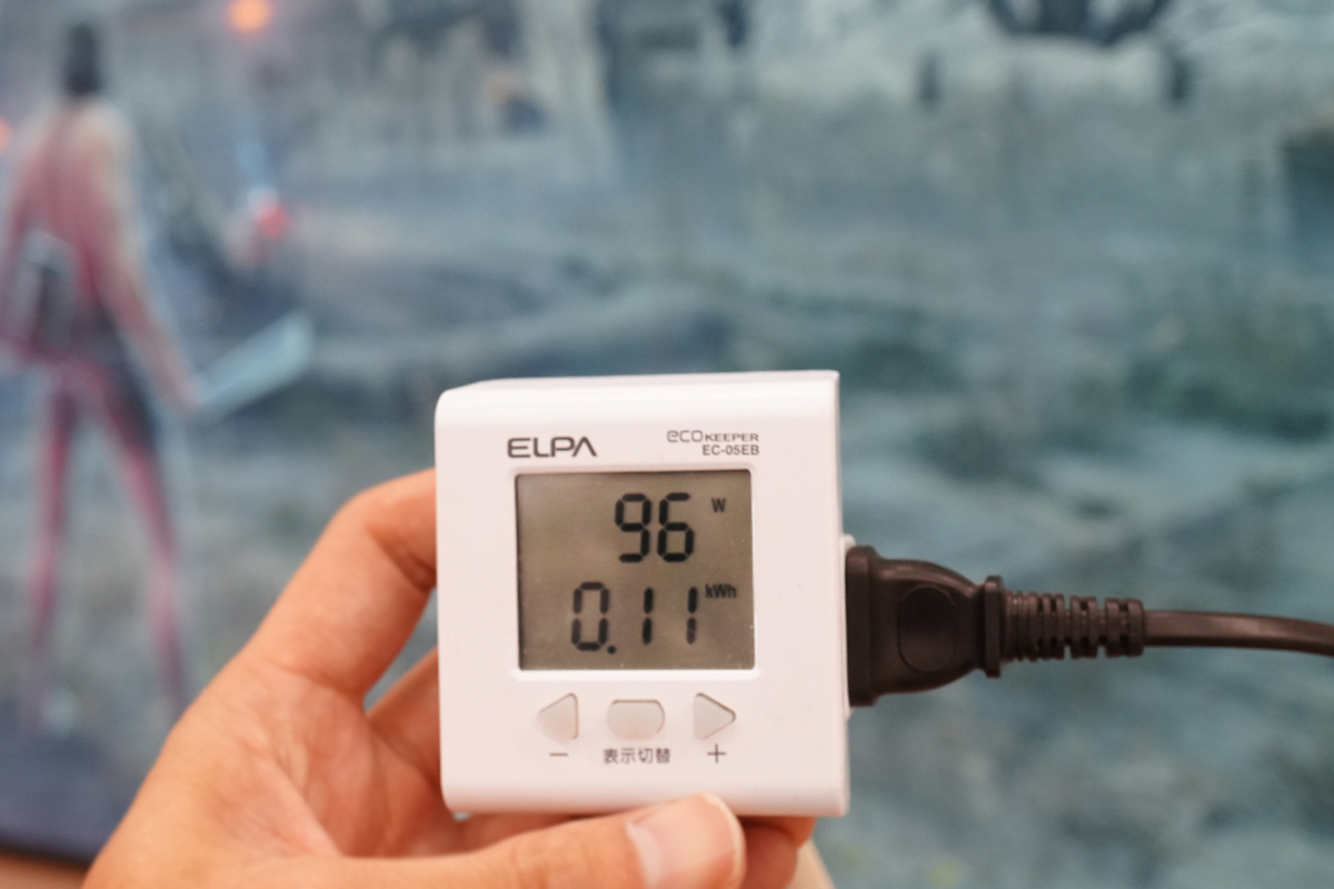 ゲームプレイ画面でも、省電力プレイ時には100Wを下回る96Wとなっていた。