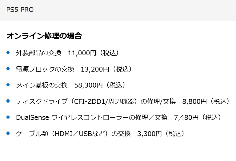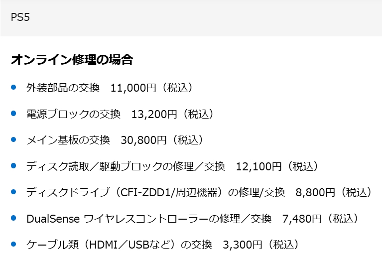 各PlayStation5の修理費用は以上の通り。