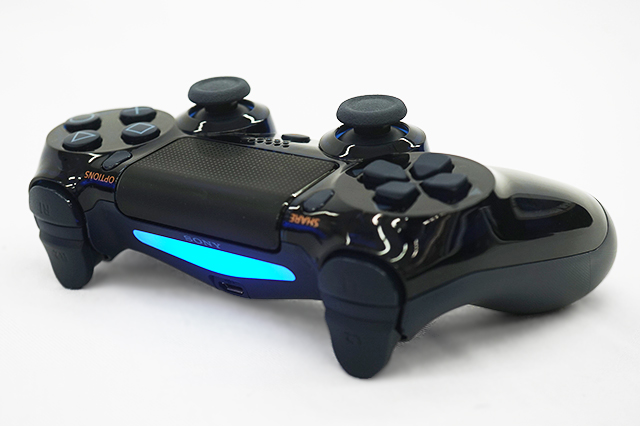 PS4 Proの本体と同じように、ライトバーの青色の光がグリップ部分の内部構造を照らすギミックがあるけれど、これもほんのすこし漏れ伝っているのがうっすら見えるくらいなのが良い。