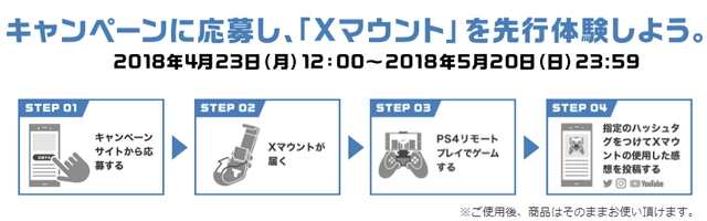 ハッシュタグ「#Xマウント」「#ゲームコントローラーマウント」「#PS4リモートプレイ」「#DUALSHOCK4」のどれかをつけて、使用した感想を投稿することが必要。