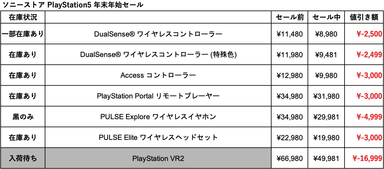 PSVR2については、セール開始時点で在庫切れとなっているけれど、もしかしたらセール中に在庫が復活する可能性はある。