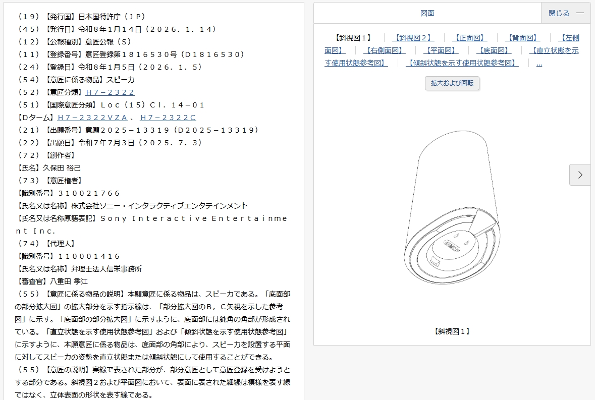 「Pulse Elevate ワイヤレススピーカー」CFI-ZWS1は、意匠登録1816530号として登録されている。