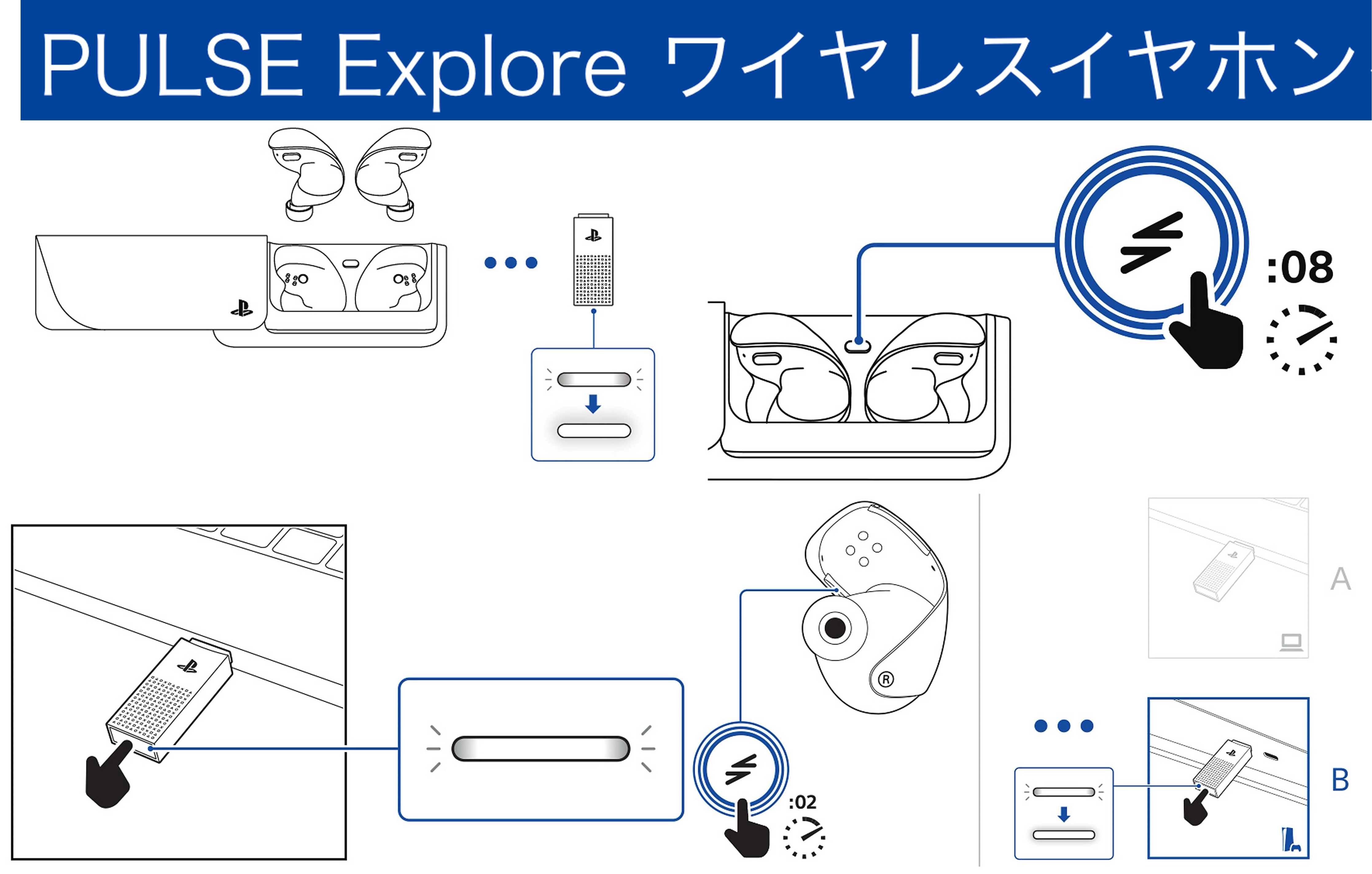 約8秒長押し:新しいPS LinkまたはBluetooth機器をペアリング(イヤホン両方収納時)