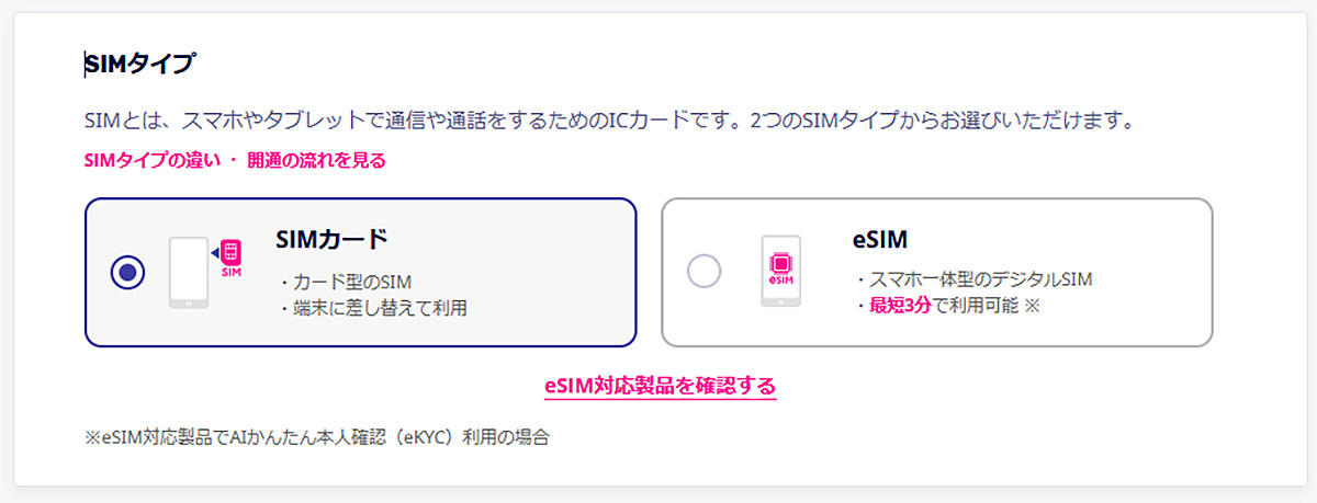 楽天モバイルで契約する場合、物理的なカード型の「SIMカード」もしくはデジタルSIMの「eSIM」の2種類がある。