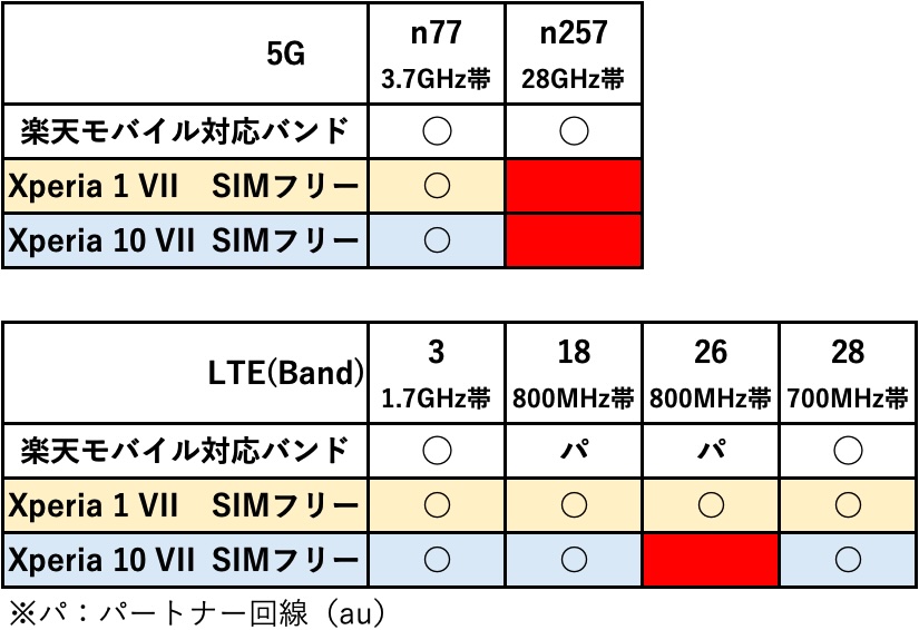 まず最初に、楽天モバイルで使用されているバンドと現在ソニーストアで販売されているSIMフリーモデルのXperiaの対応バンドを比較してみる。
