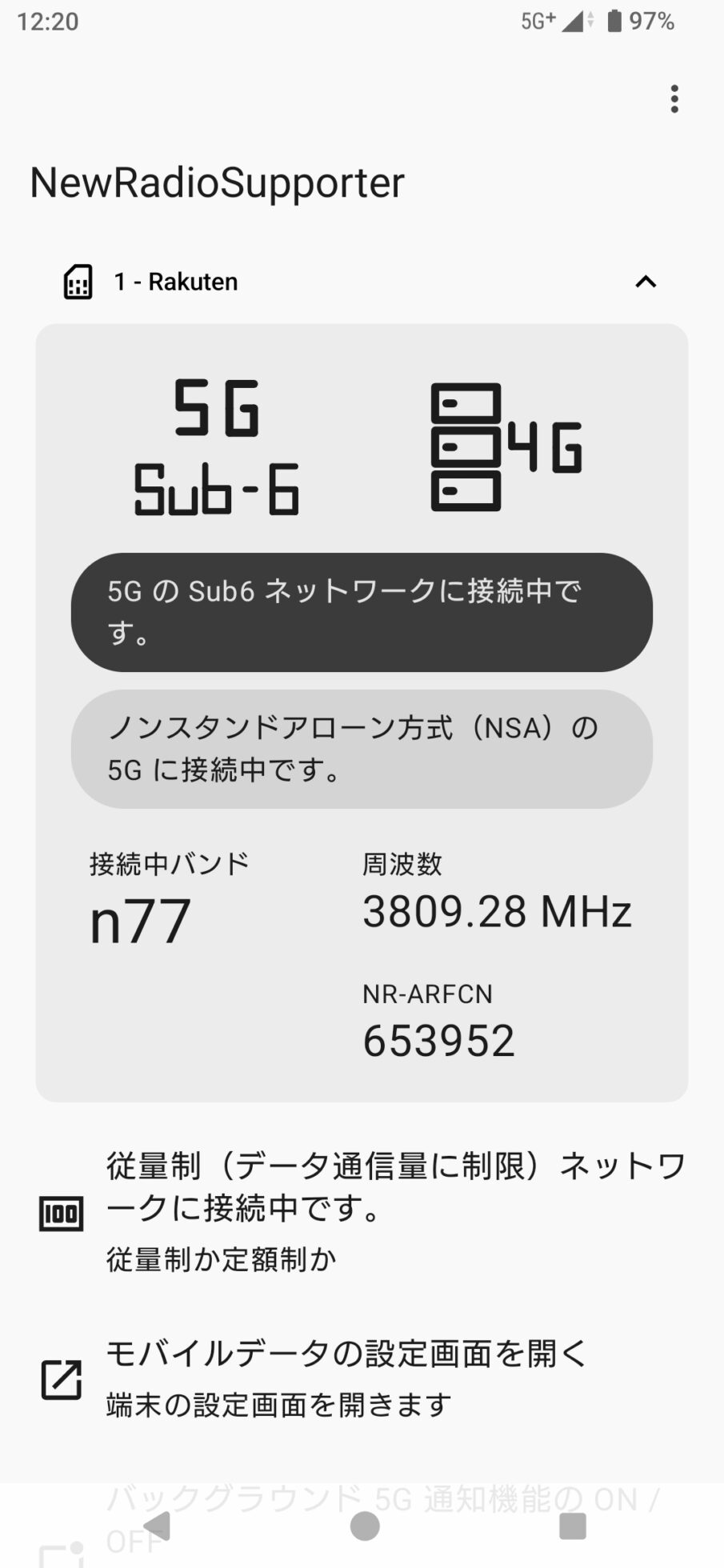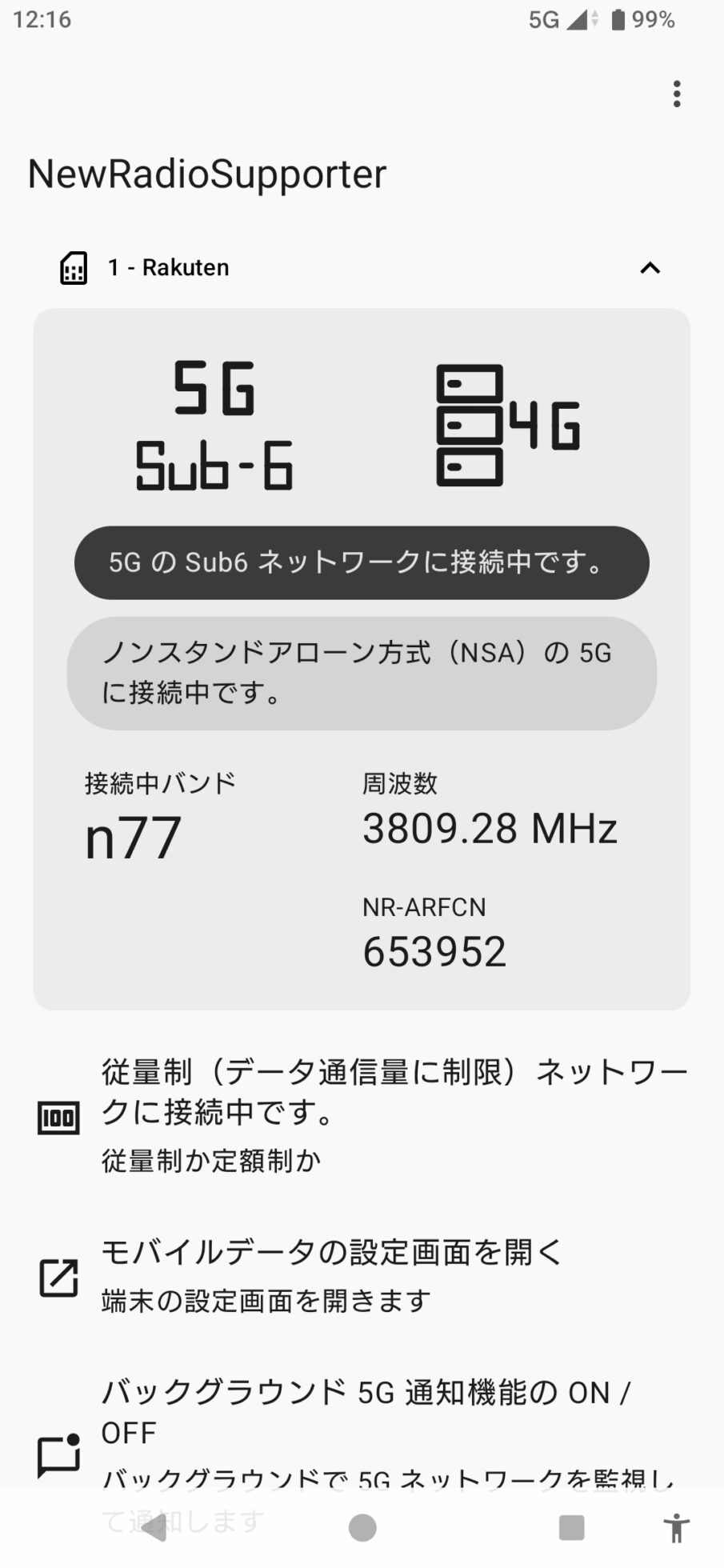 楽天モバイルの場合、5G SAは2026年度に対応する予定のため、現時点ではノンスタンドアローン(NSA)で接続されている。