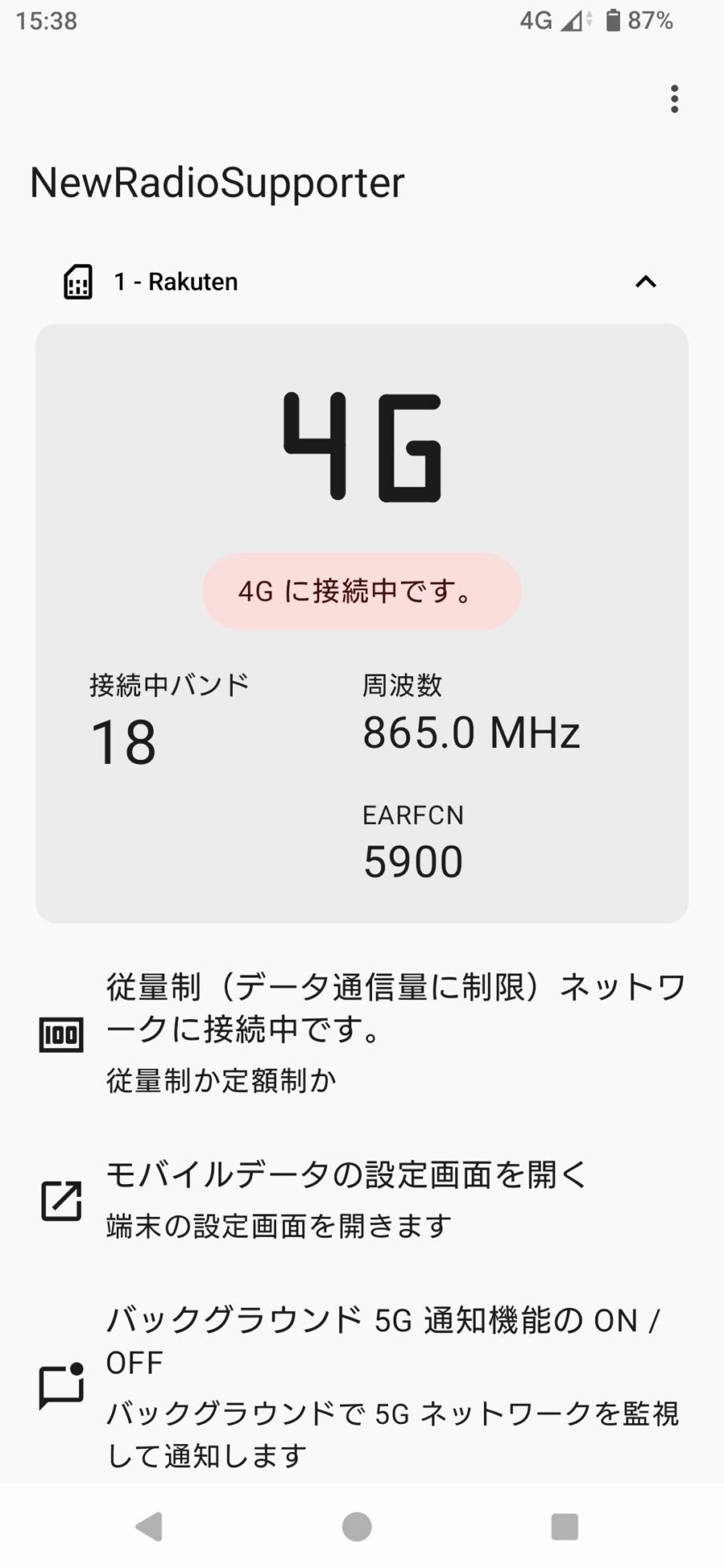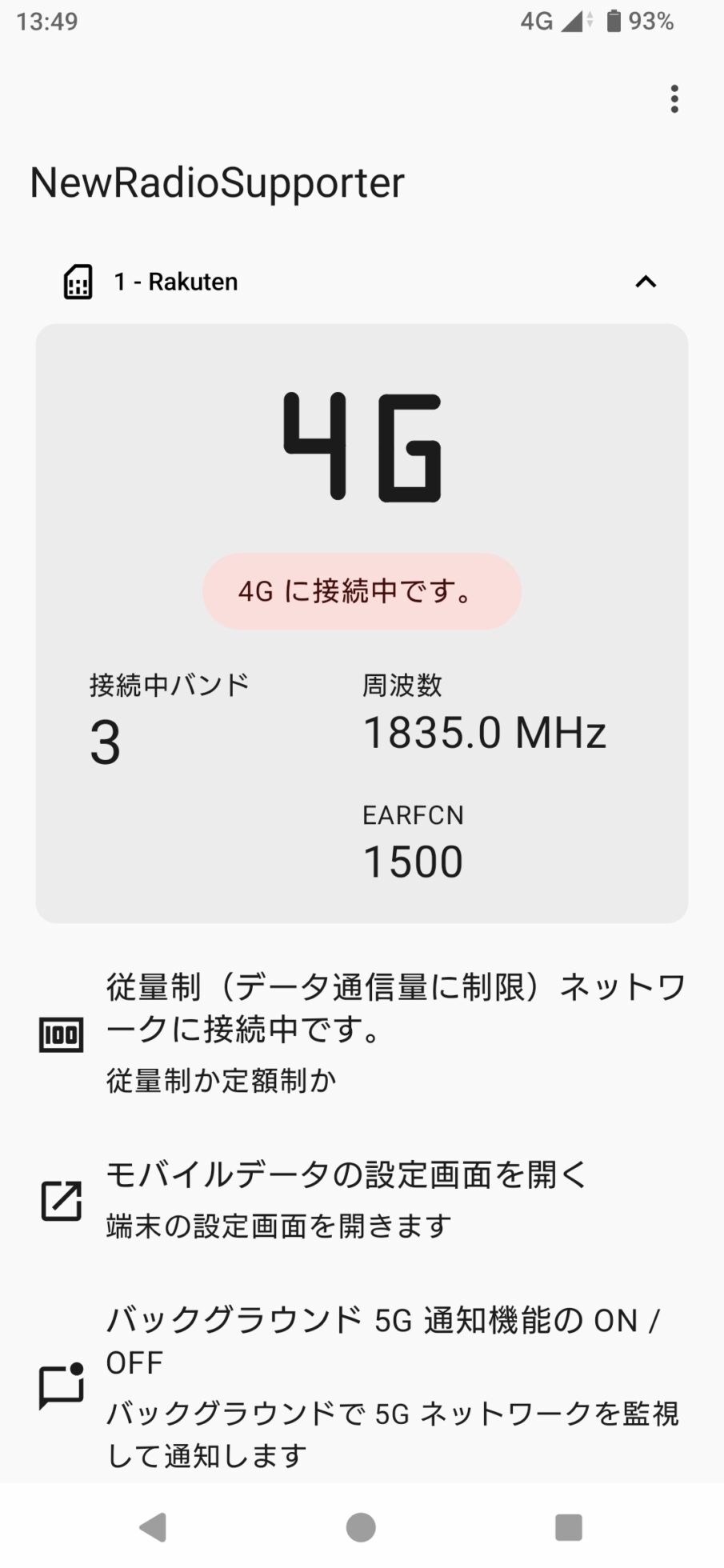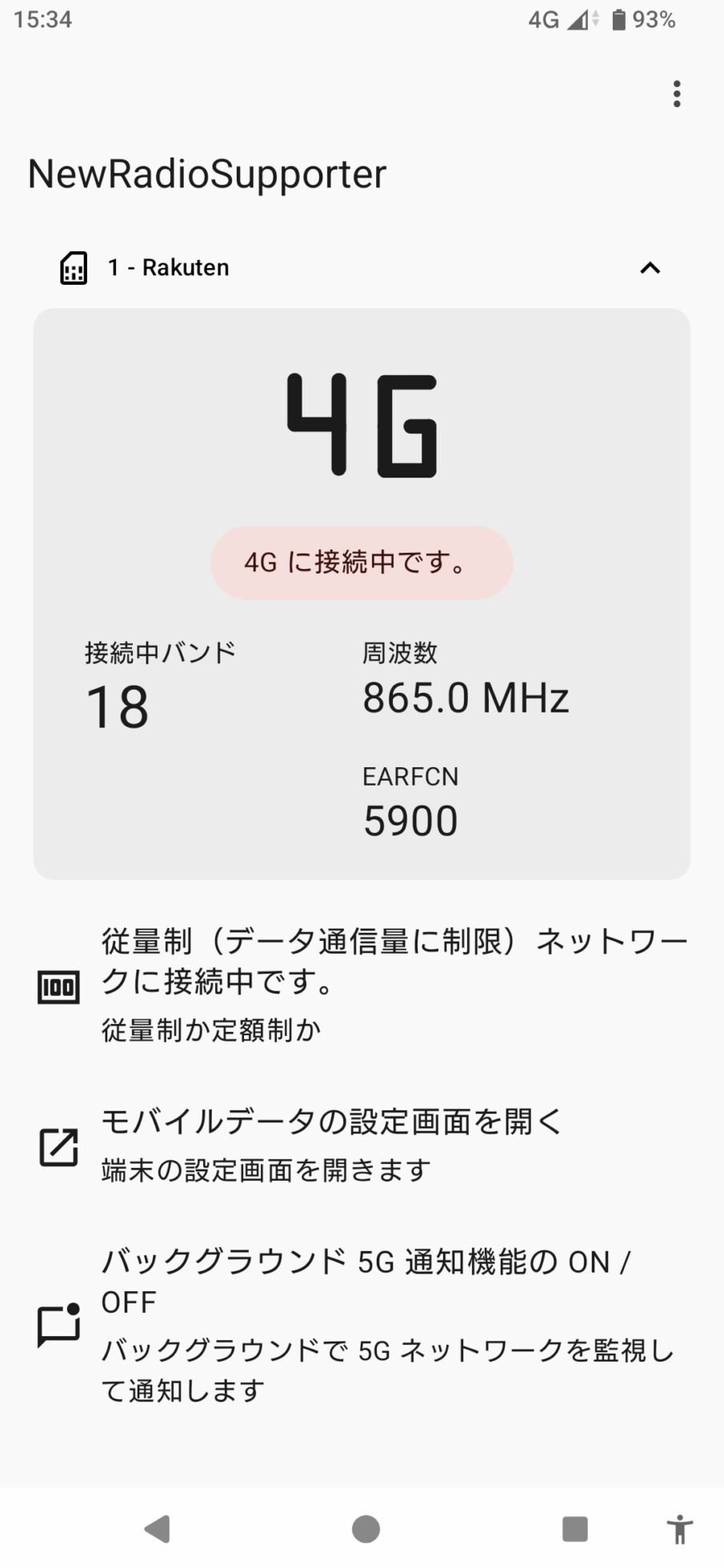 接続されるバンドは4G(LTE)のバンド3となり、楽天モバイル自前のバンドをつかむことが出来た。