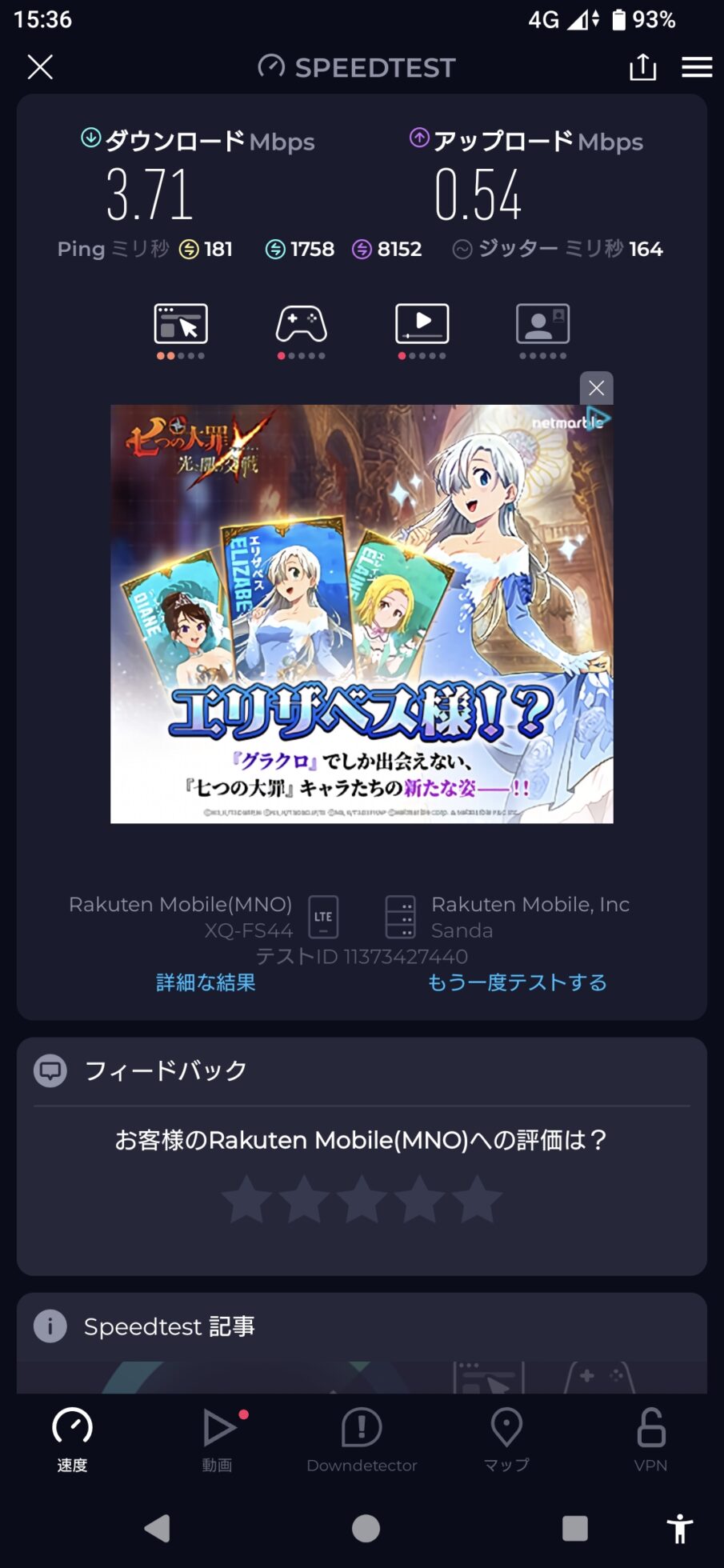 次に、5Gの基地局から遠く離れて、楽天モバイル4G(LTE)エリアでスピードテストしてみた。