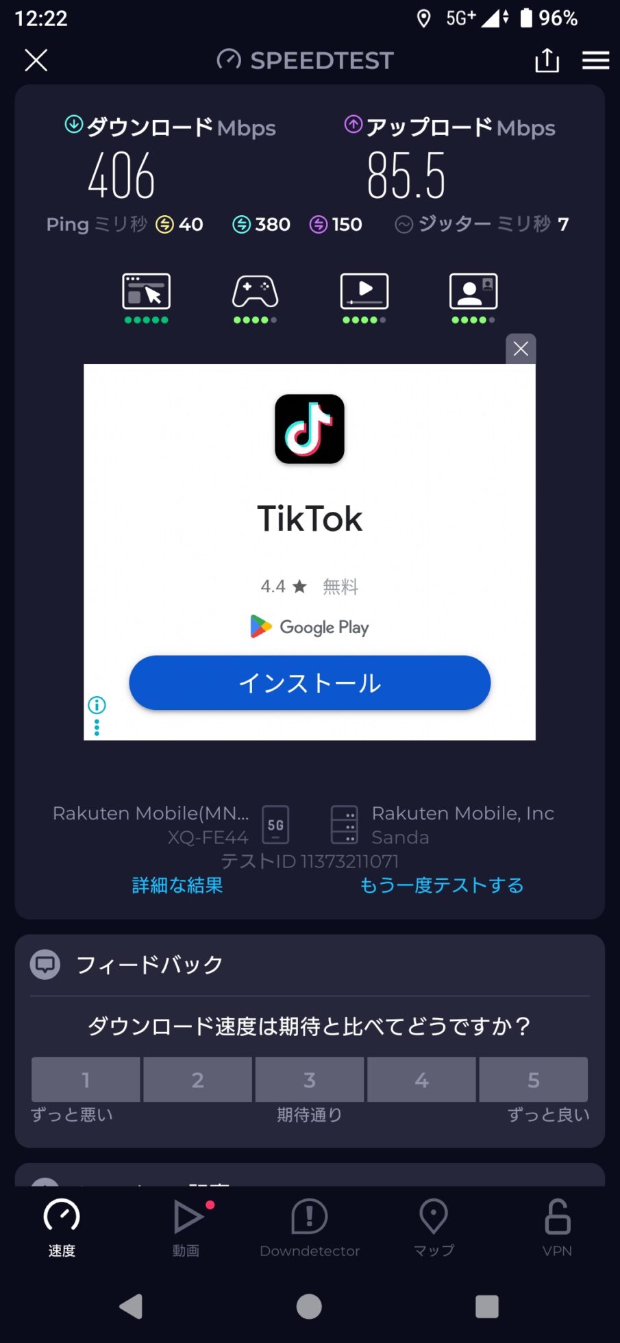 通信速度はダウンロード406Mbps、アップロード85.5Mbpsと良好。