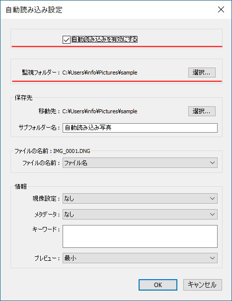 そして、監視フォルダーを、「Remote Camera Control」で保存先に指定したフォルダーを選んでおく。