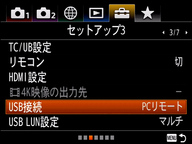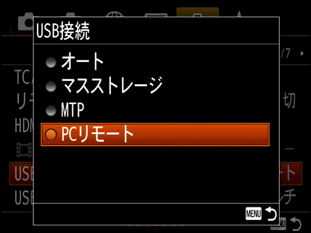 カメラ側の準備としては、「メニュー」から[USB接続]設定を[PCリモート]に変更しておくこと。