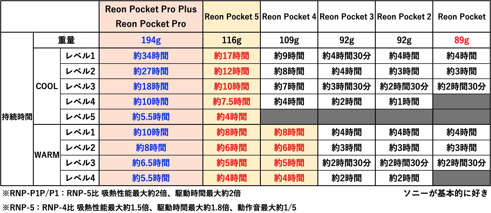 アルゴリズムの変更によるバッテリー持続時間について、「REON POCKET PRO Plus」は本体仕様が同じREON POCKET PROと持続時間は同等。