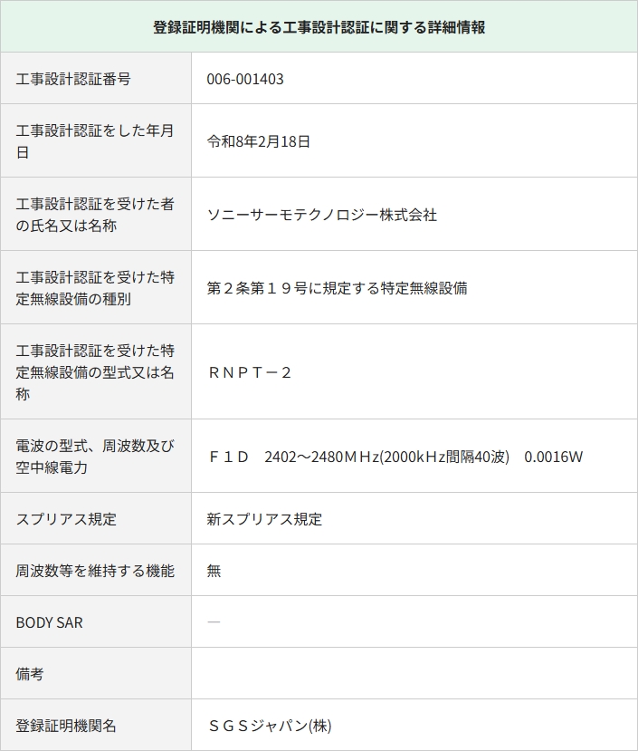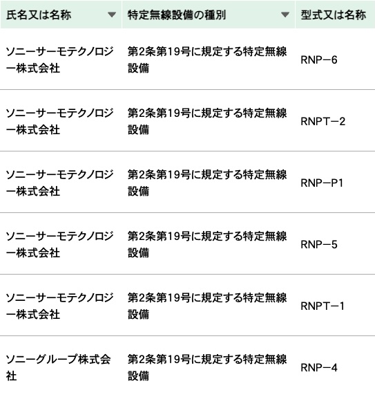 REON POCKET関連の技適認証情報を確認していると、ソニーサーモテクノロジー株式会社として直近で「RNP-6」という名称の機器を登録しているのを発見。