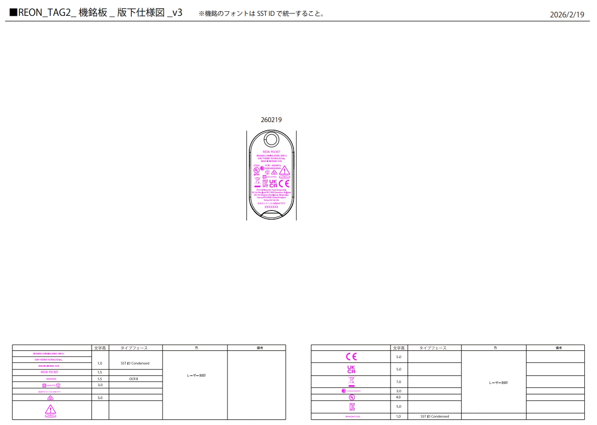 資料を見ていくと、ラベル情報にはREON POCKET TAG2(RNPT-2)の外観デザインが確認できる。