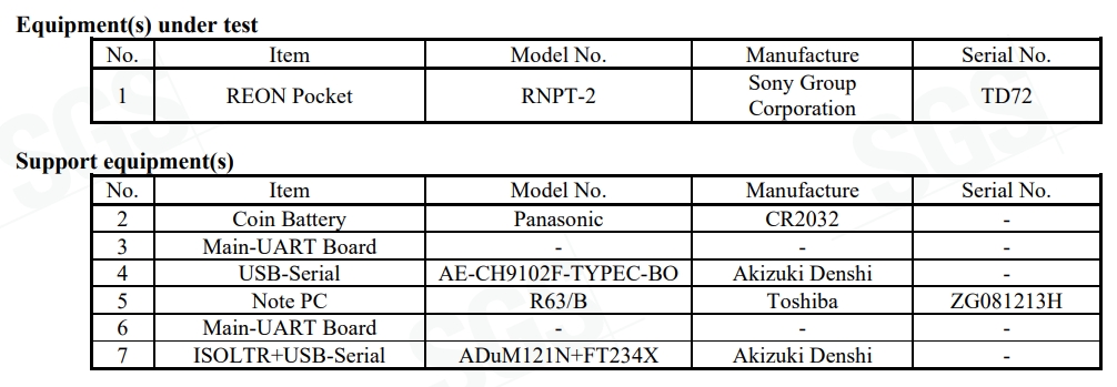 現在REON POCKET専用ウェアラブルセンシングデバイス(RNPT-1)が販売されているため、おそらく後継モデルとなるREON POCKET TAG2(RNPT-2)と思われる。