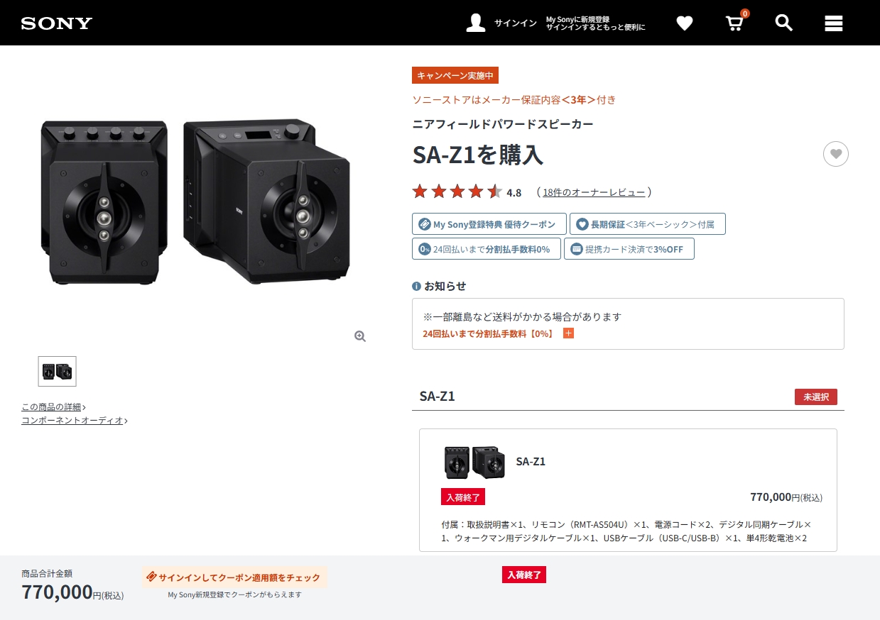 ニアフィールドパワードスピーカー「SA-Z1」は、ソニーストアでは既に入荷終了となり購入することができない。
