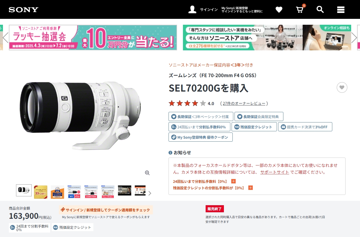 2014年に発売された ソニー初のフルサイズEマウント望遠ズームレンズ FE 70-200mm F4 G OSS「SEL70200G」が、ソニーストアで販売終了。
