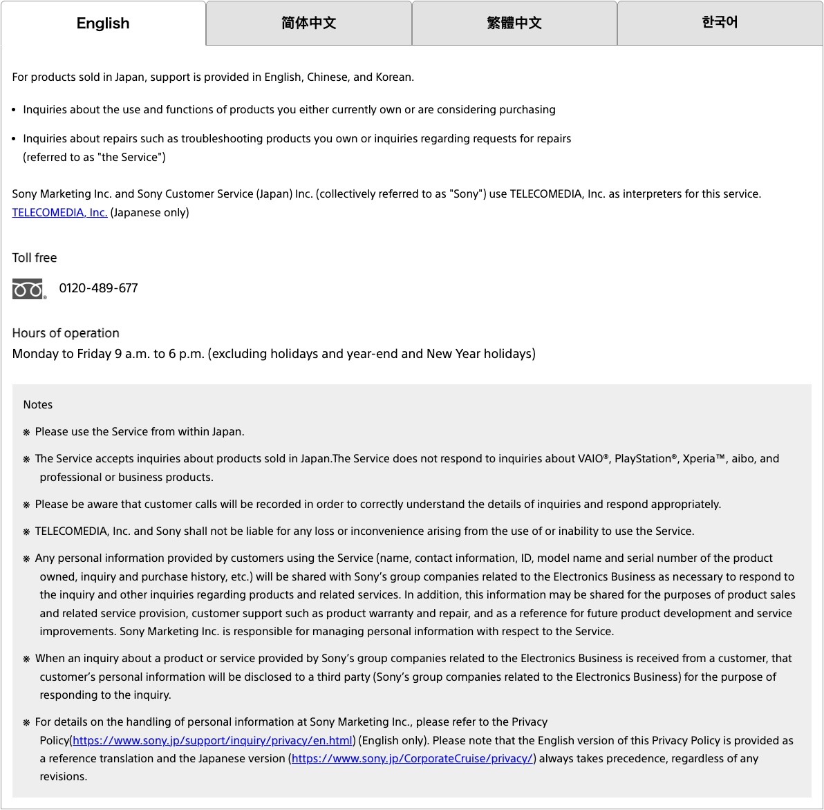 また、VAIO®、PlayStation®、Xperia™、aibo、プロフェッショナル・ビジネス製品に関する問い合わせには対応していない。