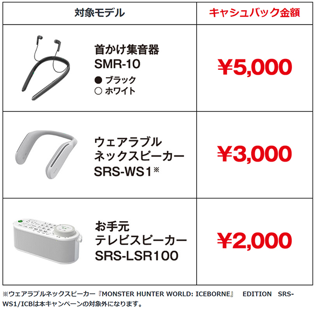 首かけ集音器「SMR-10」を購入すると5,000円ウェアラブルネックスピーカー「SRS-WS1」を購入すると3,000円お手元テレビスピーカー「SRS-LSR100」を購入すると2,000円もらえる「敬老の日キャッシュバックキャンペーン 」を2019年8月6日(火)から2019年9月30日(月)までの期間限定で開催。