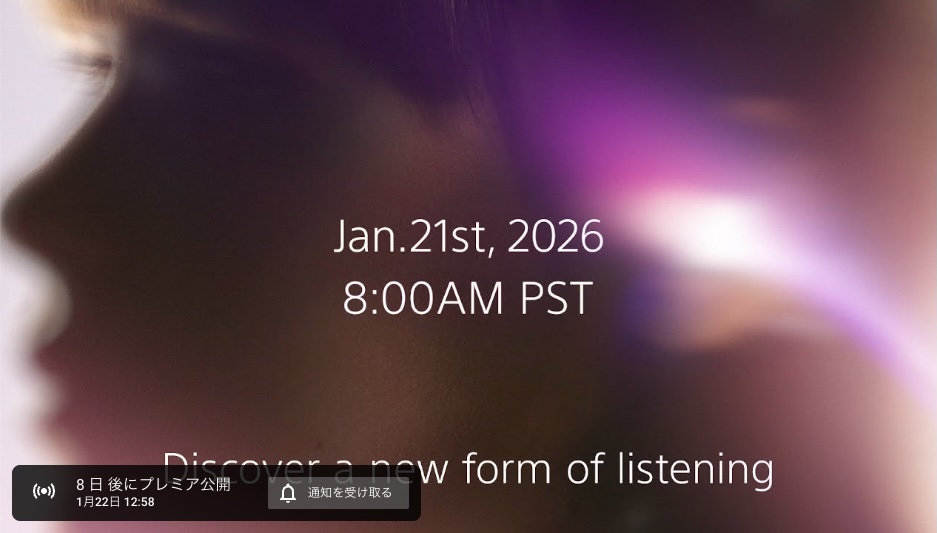 概要欄にも「Jan.21, 2026 8:00 AM PST / Jan.22, 2026 1:00 AM JST Discover a new form of listening」と掲載されているため、おそらくYouTubeの動画公開設定ミスと思われる。