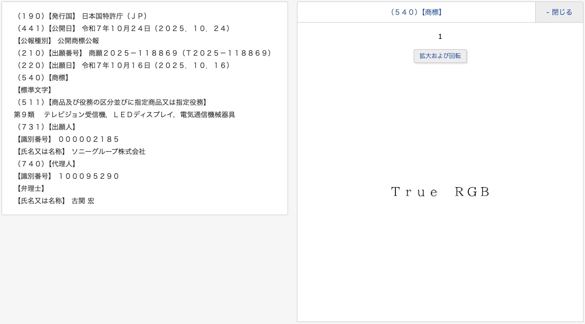 ソニーは、テレビジョン受信機、LEDディスプレイ、電気通信機械器具向けの商標として”True RGB“という名称を出願。