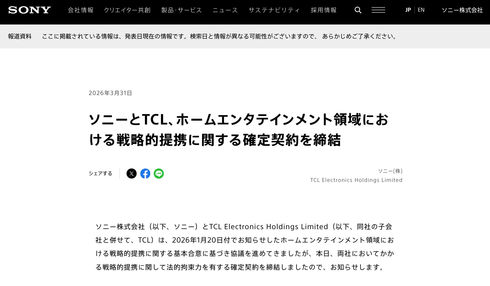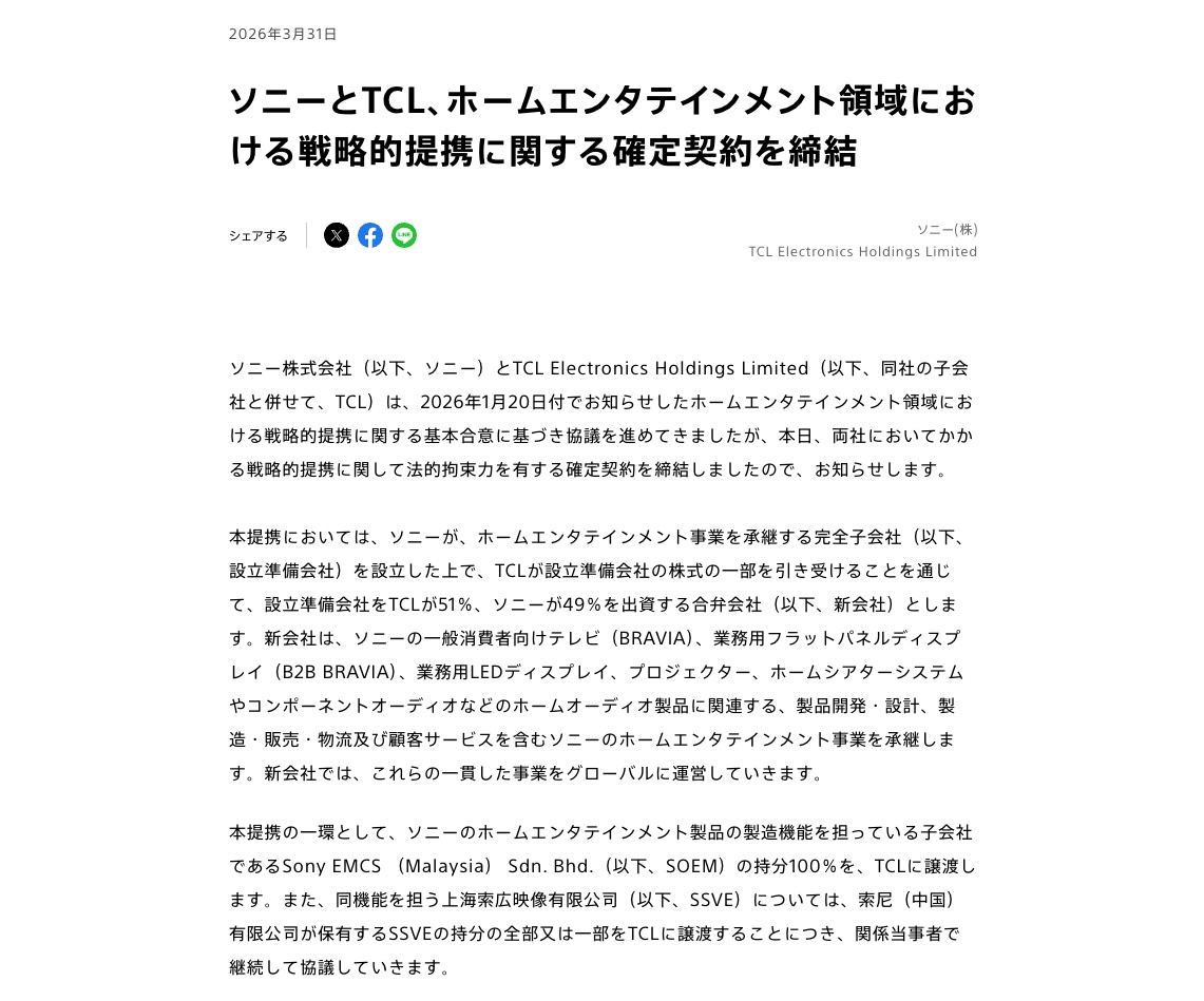 ソニー株式会社(以下、ソニー)とTCL Electronics Holdings Limited(以下、同社の子会社と併せて、TCL)は、2026年1月20日付でお知らせしたホームエンタテインメント領域における戦略的提携に関する基本合意に基づき協議を進めてきましたが、本日、両社においてかかる戦略的提携に関して法的拘束力を有する確定契約を締結しましたので、お知らせします。