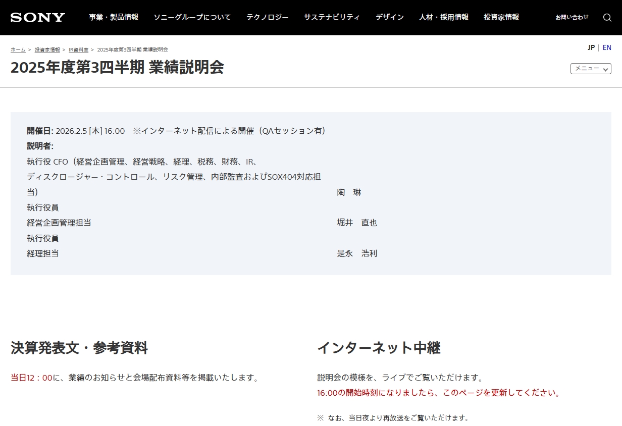 ソニーは、2025年度第3四半期 業績説明会を2月5日(火)16時より開催する。