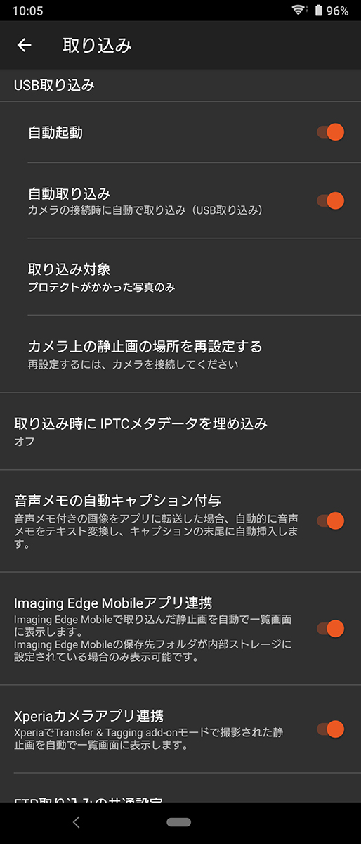 設定から変更可能で、自動起動のオンオフ、自動取り込みのオンオフ、取り込み対象を[すべての写真] か [プロテクトがかかった写真のみ] から選べる。