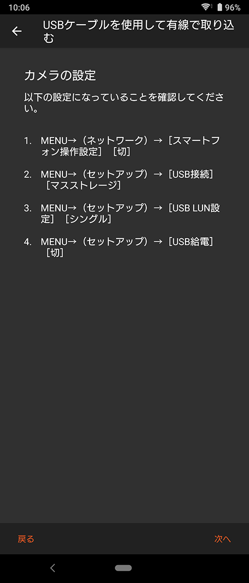 USB接続での画像取り込みは、USB Host 機能, USB-C端子, Mass Storage Class サポートした Android端末のみ。