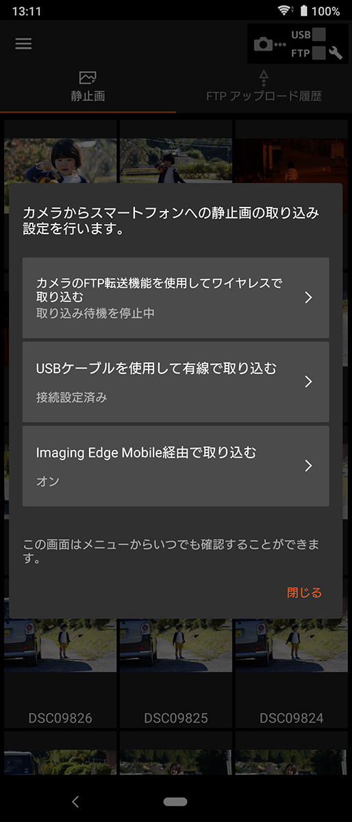 ただし、FTPでの画像取り込みができるのは静止画(JPEGのみ)のオリジナルサイズに限られる。