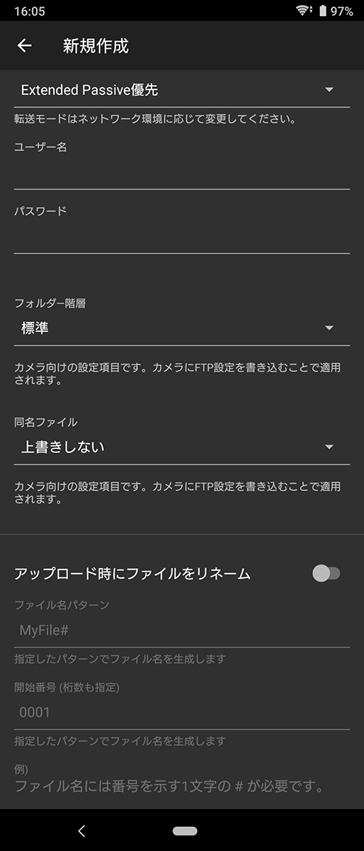 アップロードする際のファイル名の変更ルールもここで設定できる。