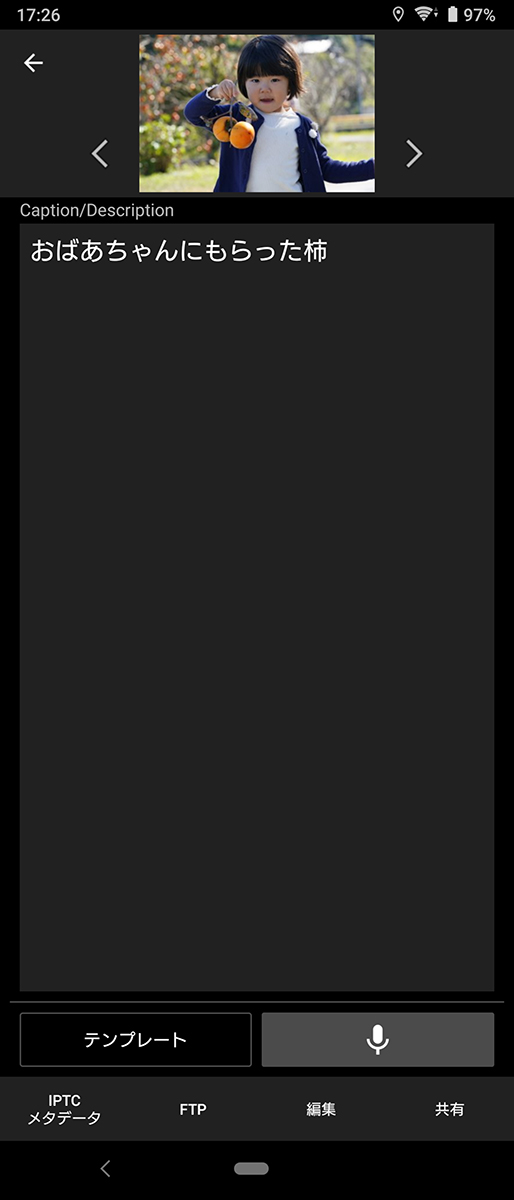 そのカメラ本体で記録した音声メモを画像と一緒に取り込むと、アプリで自動的にテキストに変換されてキャプションの末尾に挿入される。