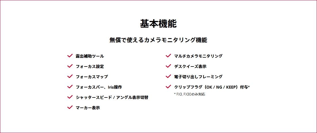 対応カメラは、2026年3月現在、 BURANO,PXW-Z300,PXW-Z200,HXR-NX800,FX6,FX3,FX2,FX30,α1 II,α1,α9 III,α7R V,α7S III,α7 V,α7 IV,α7CR,α7C II,ZV-E1。