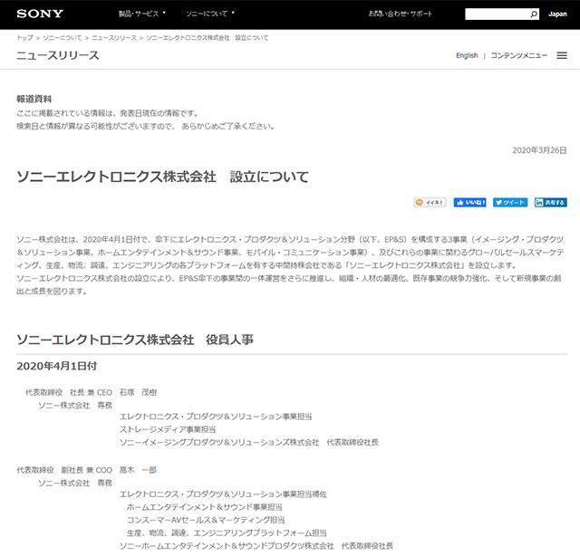 ソニー株式会社、2020年4月1日付で「ソニーエレクトロニクス株式会社」を設立。