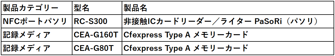 このほか、 PaSoRiの新モデル「RC-S300」、CFexpress Type A メモリーカード「 CEA-Gシリーズ」が値上がり。