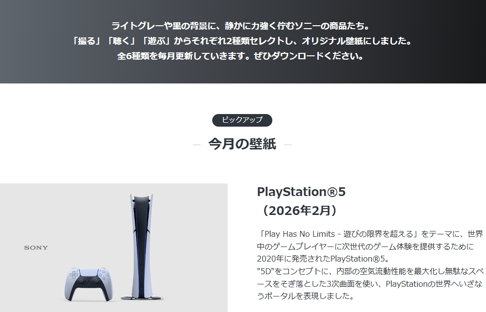 全6種類を毎月更新するとしていて、ソニー製品の実機写真を使った壁紙を今後6種類入手することが出来る。