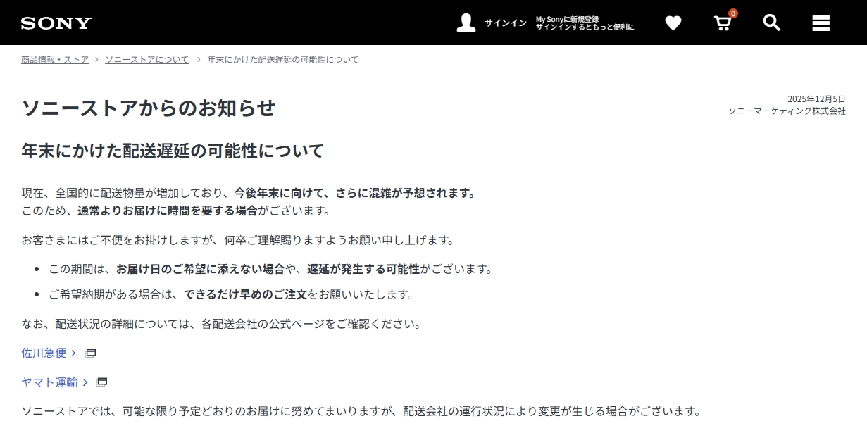 ソニーストア、2025年”年末にかけた配送遅延の可能性”をお知らせ。同様の内容が佐川急便からも案内。