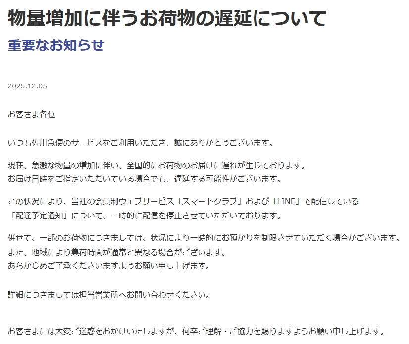 ・2025.12.05 物量増加に伴うお荷物の遅延について(佐川急便)