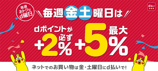 期間中の金・土曜日に、ソニーストアの支払い方法として、「d払い(ドコモ)」を利用するとdポイントが必ず+2%、最大+5%もらえるd払い(ドコモ)「毎週おトクなd曜日」 を開催。