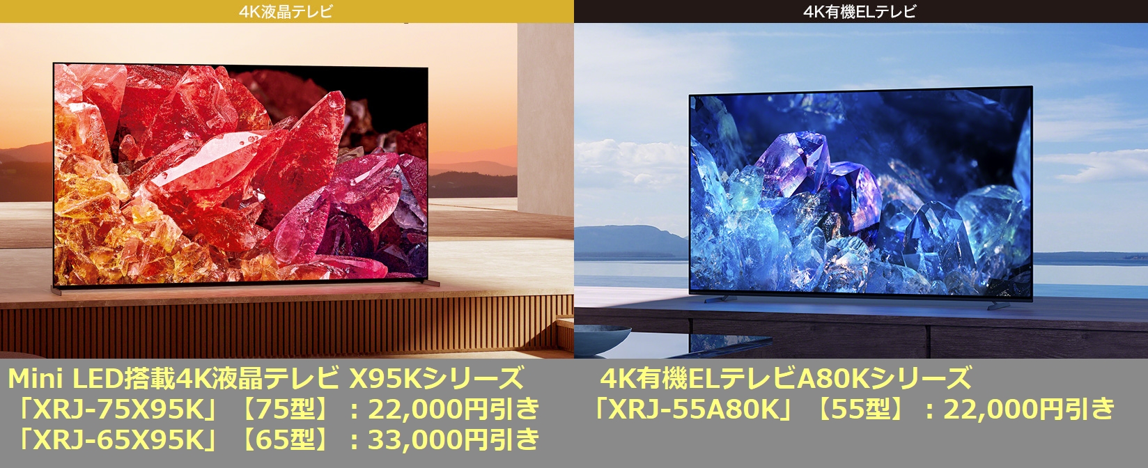 ソニーストアで、2022年モデル Mini LED搭載4K液晶テレビ75型「XRJ-75X95K」、65型「XRJ-65X95K」、4K有機ELテレビ55型「XRJ-55A80K」、2021年モデル55型「XRJ-55X90J」を値下げ。特典クーポンを駆使すればさらに安価に購入可能。