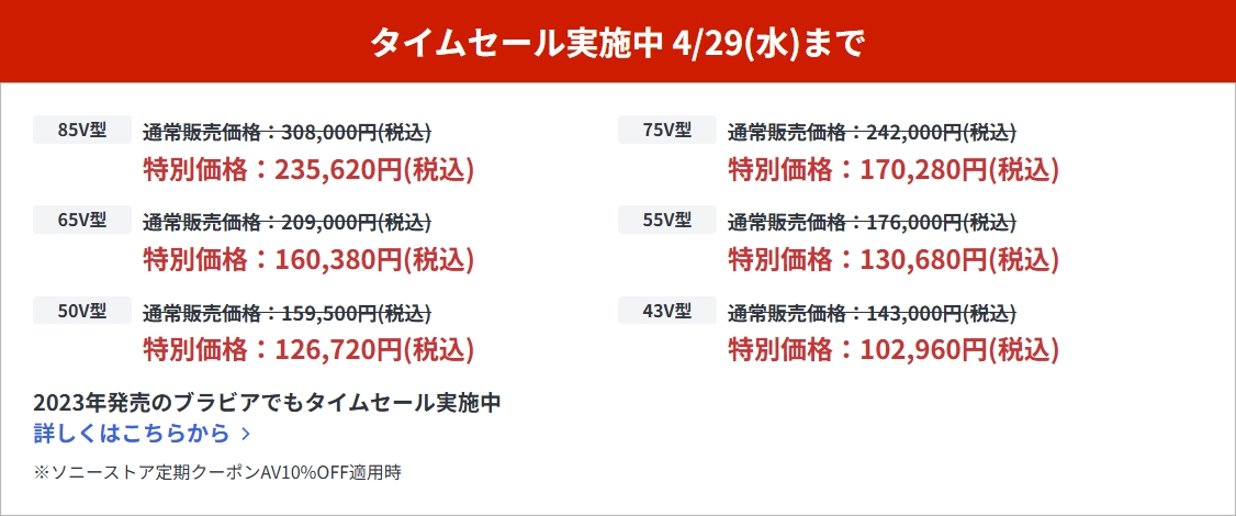 SONY 4K液晶テレビ ブラビア BRAVIA X81Lシリーズ 最大52,800円値下げ、BRAVIA X75WLシリーズ 最大19,800円値下げのタイムセール。2026年4月29日(水)まで。