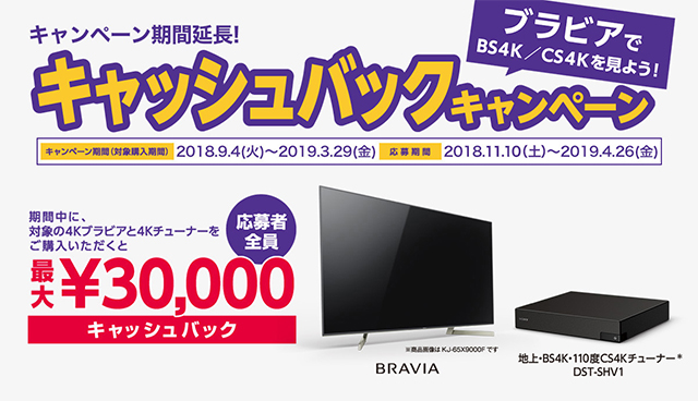 4K BRAVIAと4Kチューナー「DST-SHV1」を購入すると、応募者全員に最大3万円がもらえる「 」の期間を2019年3月29日(金)まで延長。