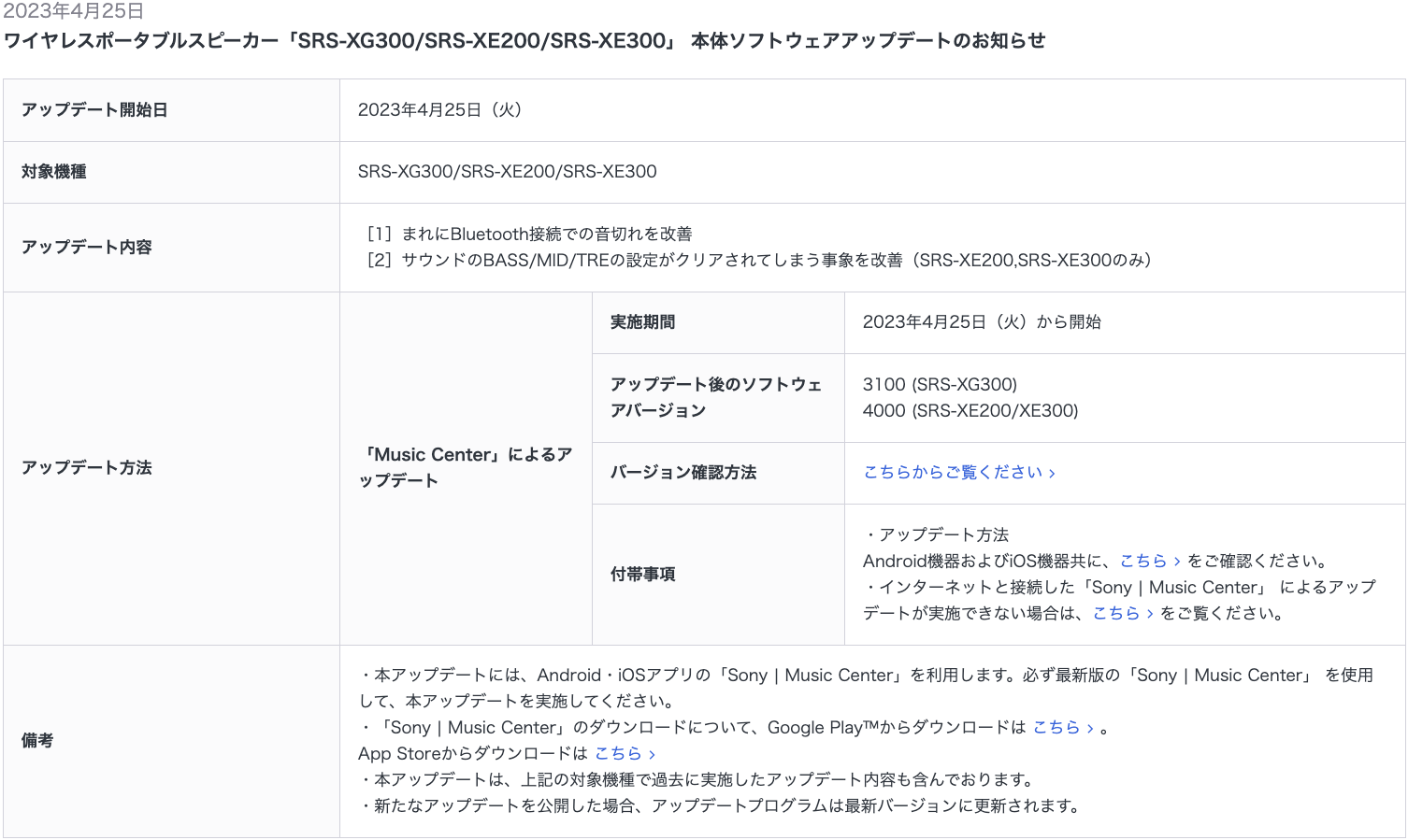 ワイヤレスホームスピーカー「SRS-RA5000 / SRS-RA3000」、ワイヤレスポータブルスピーカー「SRS-XG300/SRS-XE200/SRS-XE300」に、本体ソフトウェアアップデート。(2023年4月25日)